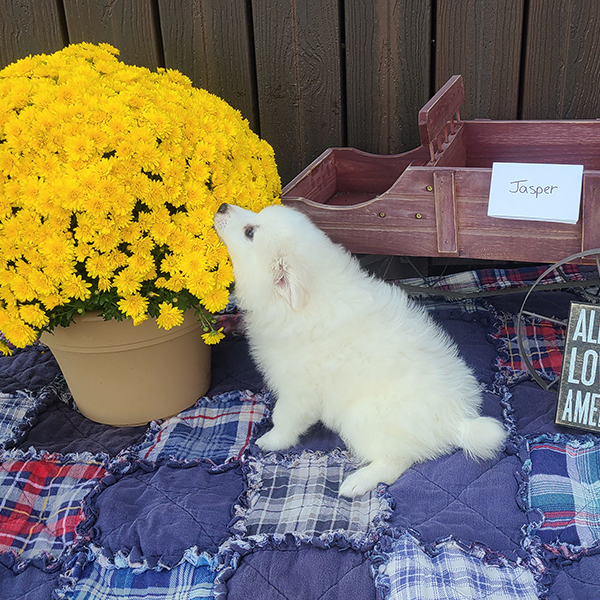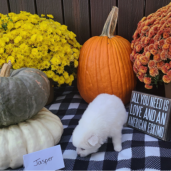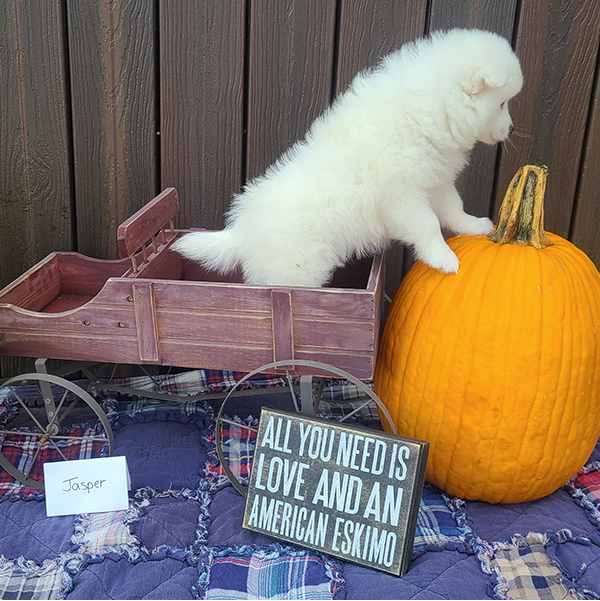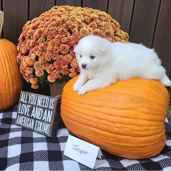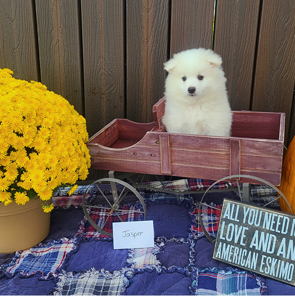Jasper is a handsome roly-poly guy full of sweetness & fun!! He is a purebred miniature American Eskimo who is fun-loving and smart making him easy to train. He loves to romp & play with his siblings & soaks up all the attention he gets from our three young children!