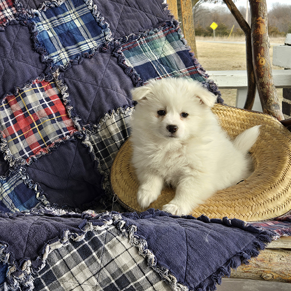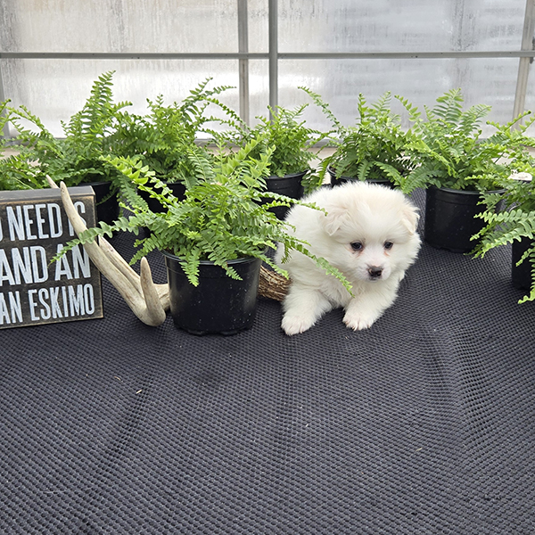 Beautiful mid-sized white dogs which make wonderful pets! They are generally 12-15 inches tall & weigh 12-20 pounds. Their ears point straight up as they listen to you! Eskimos are very loving & affectionate.  If you are sitting on the couch,  they will typically be that dog that will be resting their head on your lap. They generally train very easily-ranking among the top scores in obedience classes.