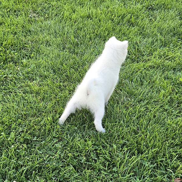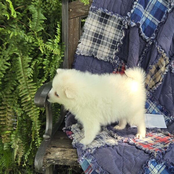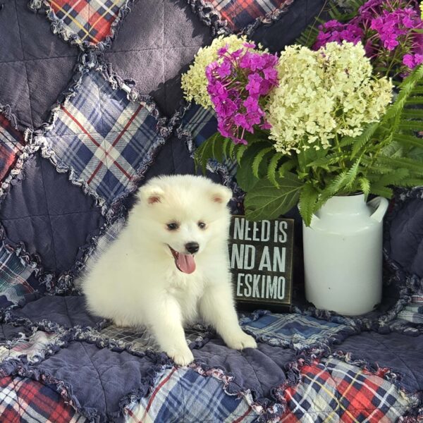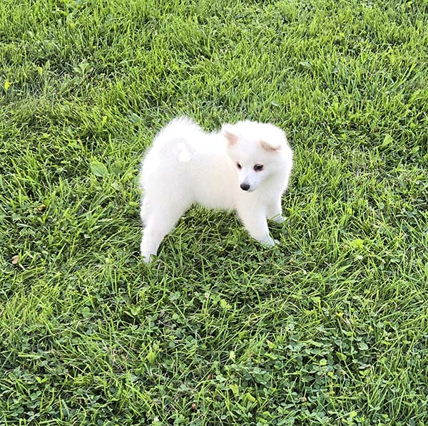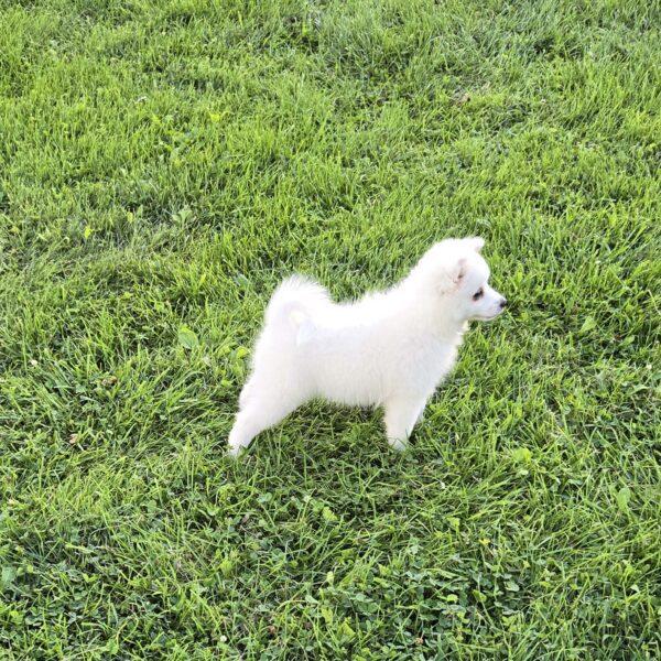 Beautiful mid-sized white dogs which make wonderful pets! They are generally 12-15 inches tall & weigh 12-20 pounds. Their ears point straight up as they listen to you! Eskimos are very loving & affectionate. If you are sitting on the couch, they will typically be that dog that will be resting their head on your lap. They generally train very easily-ranking among the top scores in obedience classes.Â