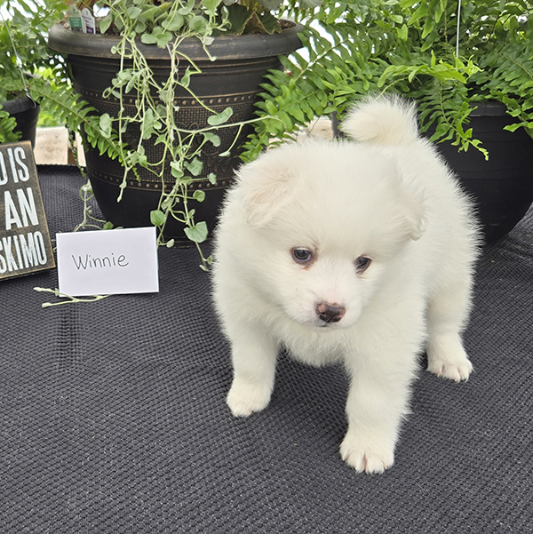 Winnie is an adorably cute girl ready to dazzle your life with her sweetness!! She is a purebred miniature-size American Eskimo who is fun-loving and smart making her easy to train. Winnie is registered with the American Pet Registry and will be up to date on all her vaccinations at eight weeks of age. She receives lots of love and attention from us & our three children!! She is just what you need for that special gift!! If you live in the Midwest, please check with us about meeting part-way for a small fee. Airline or ground transportation is also available.