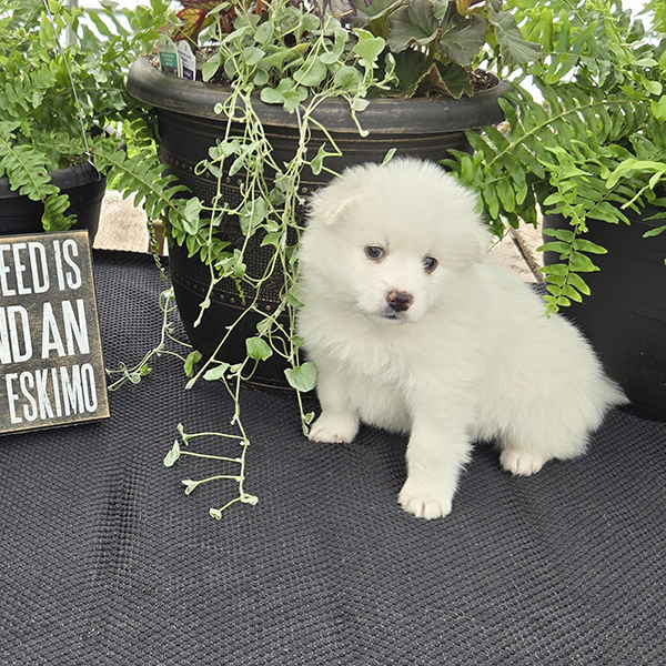 Beautiful mid-sized white dogs which make wonderful pets! They are generally 12-15 inches tall & weigh 12-20 pounds. Their ears point straight up as they listen to you! Eskimos are very loving & affectionate. If you are sitting on the couch, they will typically be that dog that will be resting their head on your lap. They generally train very easily-ranking among the top scores in obedience classes.