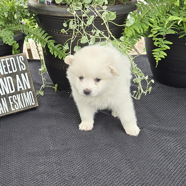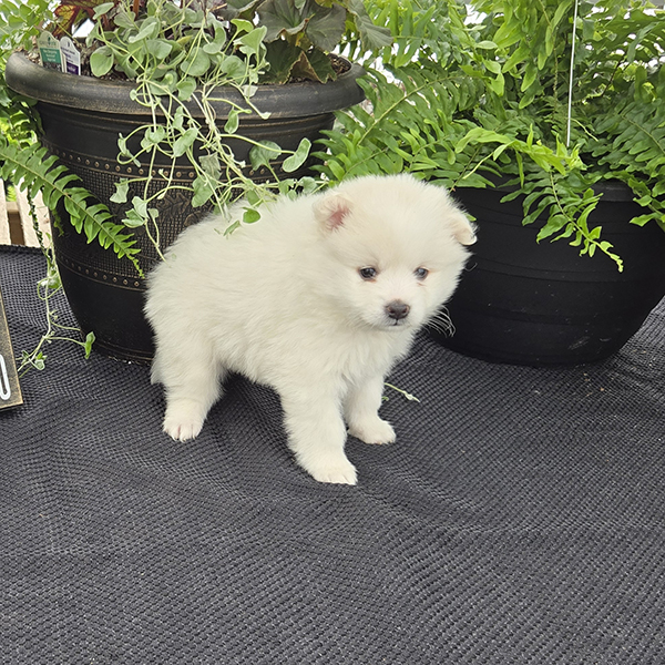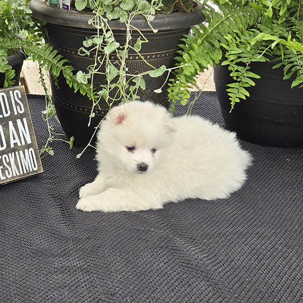 Beautiful mid-sized white dogs which make wonderful pets! They are generally 12-15 inches tall & weigh 12-20 pounds. Their ears point straight up as they listen to you! Eskimos are very loving & affectionate. If you are sitting on the couch, they will typically be that dog that will be resting their head on your lap. They generally train very easily-ranking among the top scores in obedience classes.